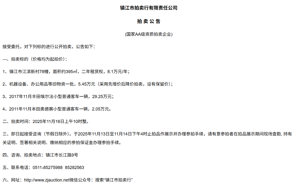 本公司受鎮(zhèn)江市公安局委托,對(duì)2025年度鎮(zhèn)江市市區(qū)摩托車(chē)上牌額度認(rèn)購(gòu)權(quán)進(jìn)行拍賣(mài),現(xiàn)將有關(guān)事項(xiàng)公告如下: